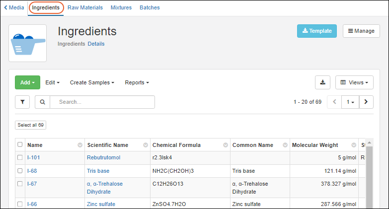 On the Ingredients tab, each ingredient row is disabled until you add a Desired Batch Yield and Unit. Once selected, the rest of the page will become enabled and populate information.Enter the exact amounts of which raw materials were used to create the mixture recipe. (If ingredients and/or amounts are unknown, see options below.) For each raw material, specify a source lot by its id number. An administrator can enhance the details show to users in this dropdown or other dropdowns by using Identifying Fields.Each ingredient in the recipe may have one or more source lots of raw material This is useful when you exhaust one lot and need to use a second lot to complete the batch. For example, using 40g of Potassium Phosphate empties a lot, if the next lot contains 45, you would need an additional 15g from another lot to reach the target amount of 100g shown in the following. Add additional lots by clicking Add raw material for the specific ingredient.Note that if one or more raw materials are indicated, the option to set an amount or raw material as unknown is no longer available.