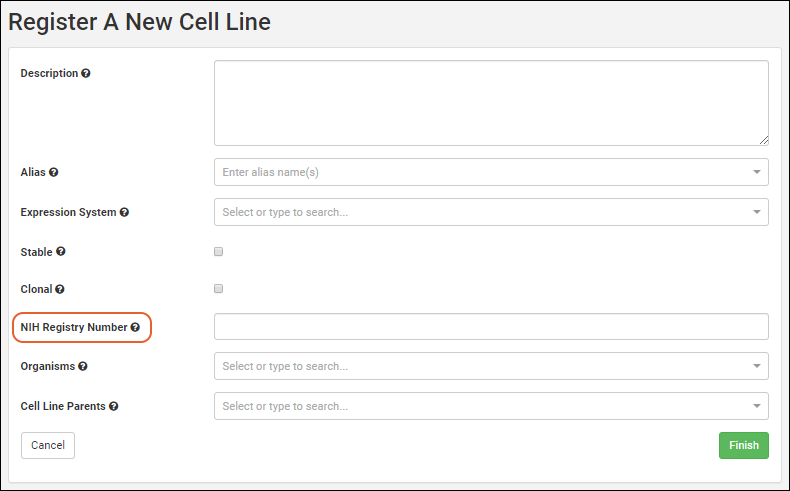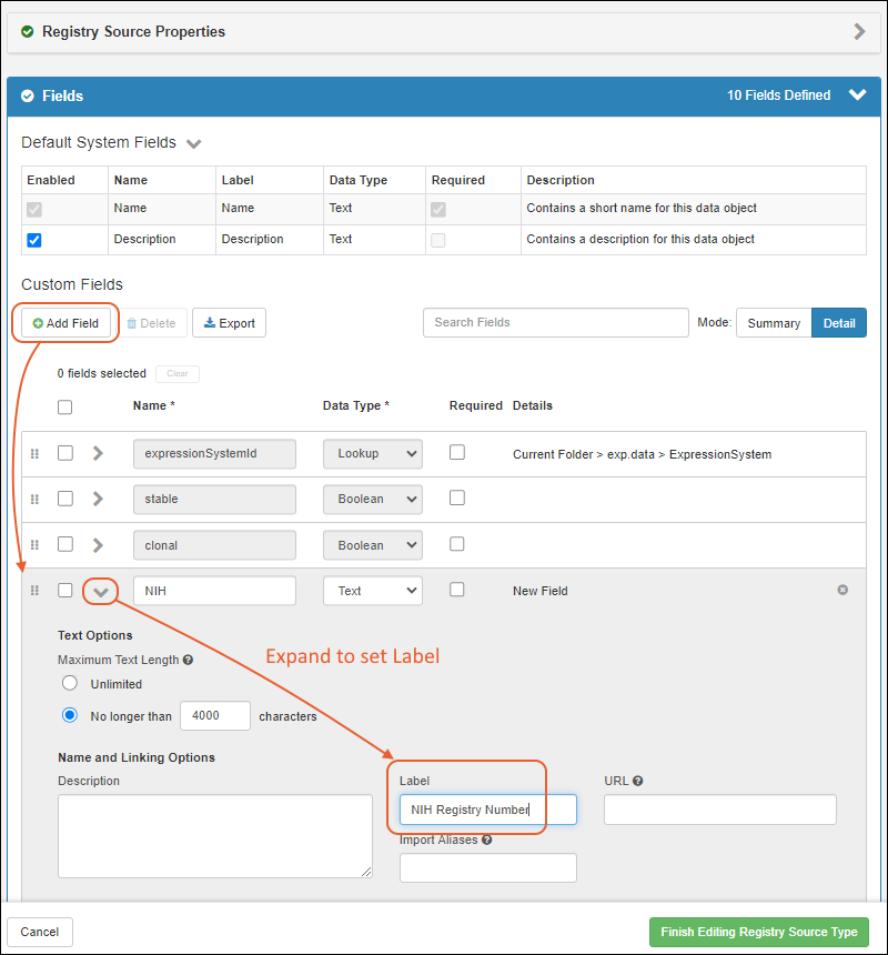To modify entry and update forms, modify the fields in the field designer. For example, to add a field "NIH Registry Number" to the Cell Line entity: