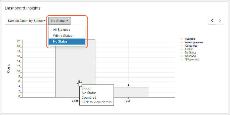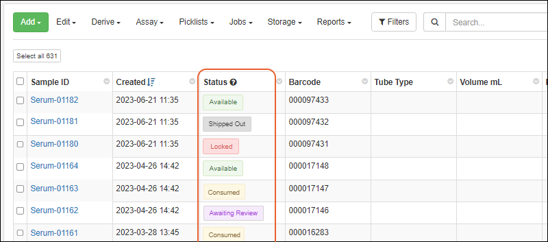 Sample Status is available as a filter for "All Sample Types" in Sample Finder. (docs)